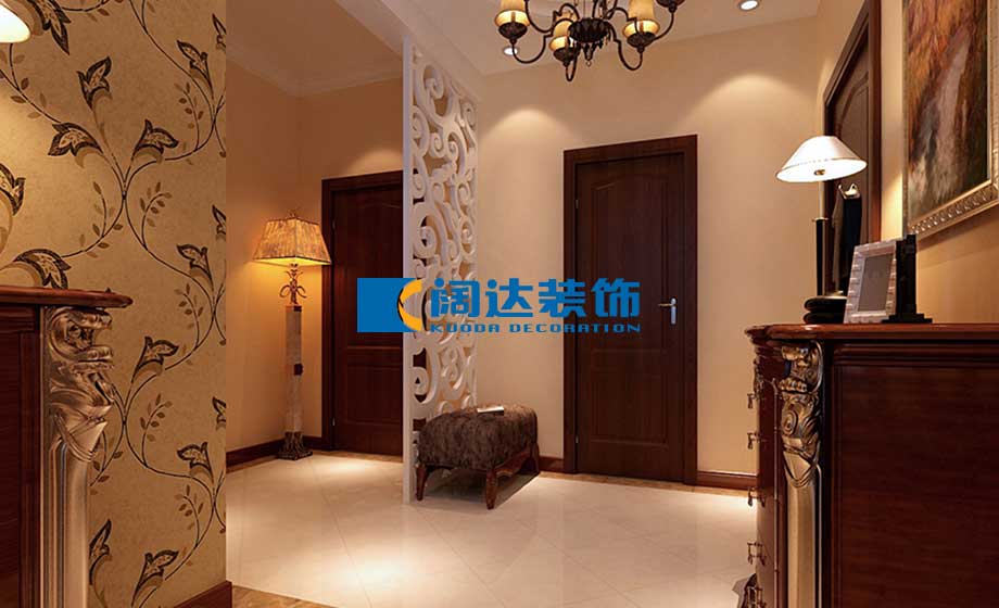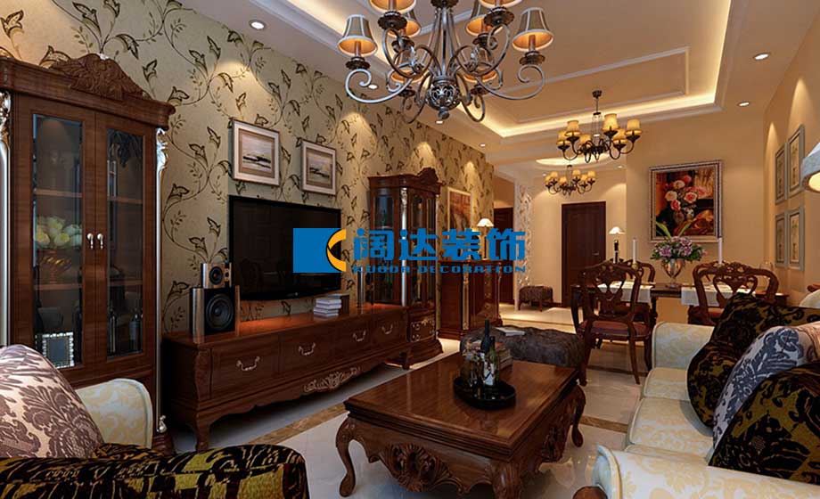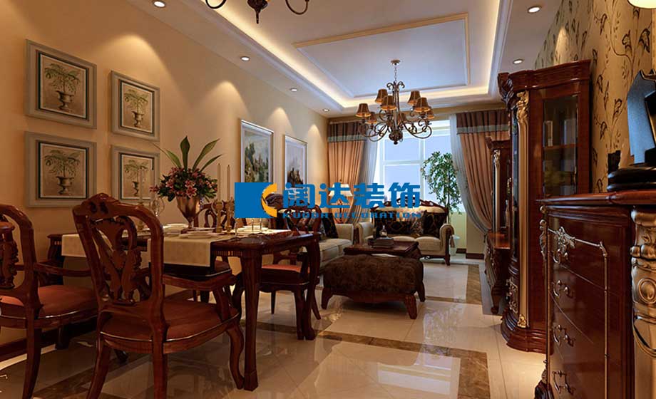 客餐廳:本案例用暖色的燈光烘托歐式的華貴檔次,深色歐式家具配以淺綠色的葉子型壁紙,為家居空間增添了一絲生命活力,玄關區(qū)域的圓形吊頂與客餐廳區(qū)域的方形吊頂配合地面的撥打線斜鋪拼花對空間功能進行了明確的劃分,提升了家居空間的整體檔次。