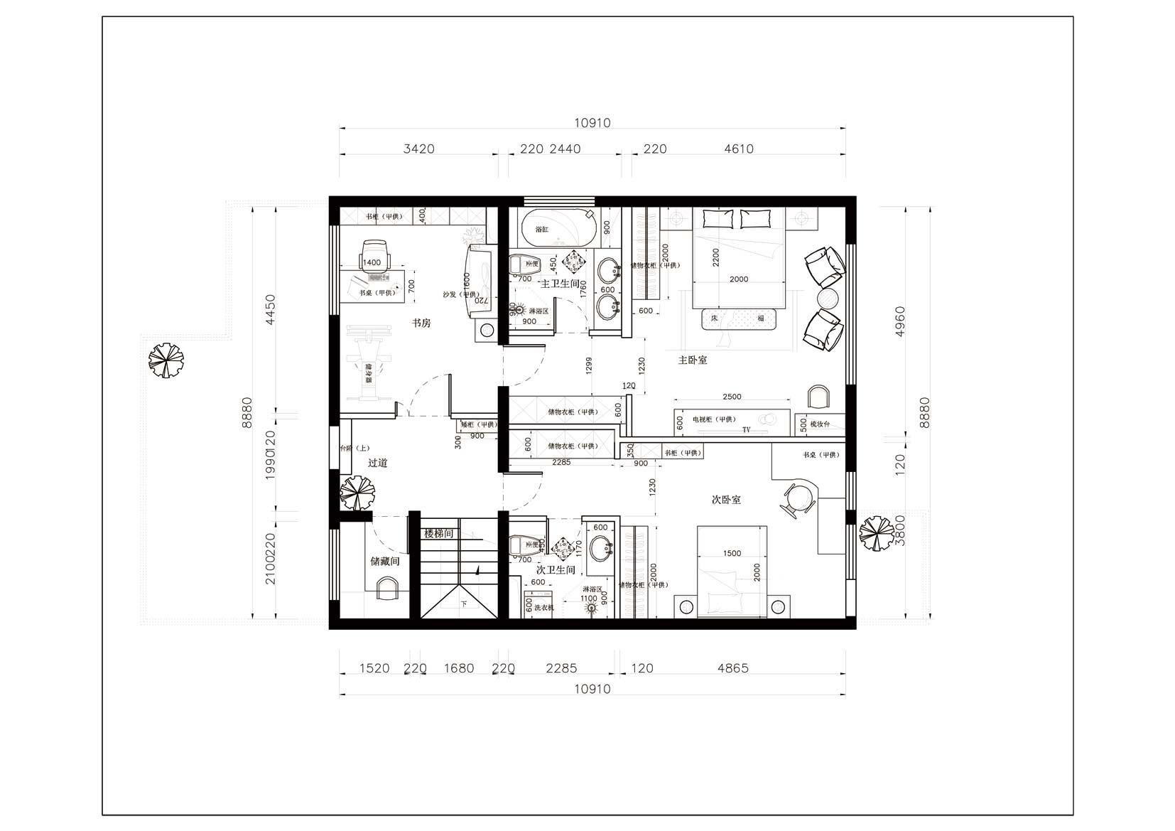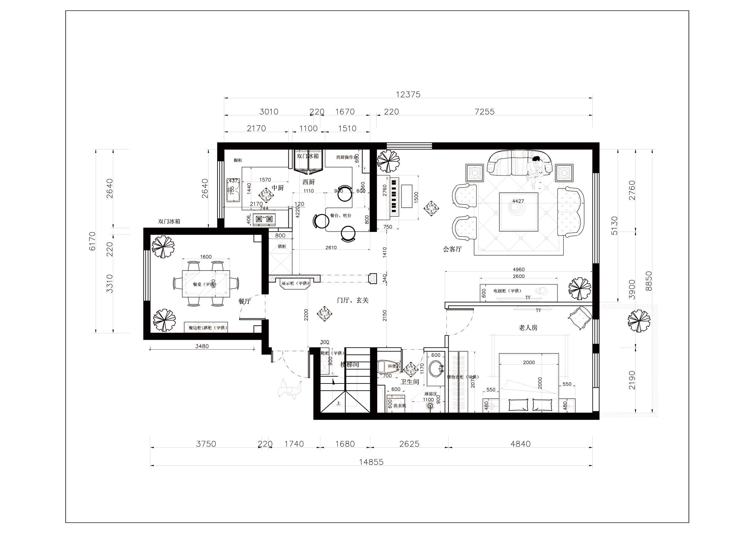 本案例業(yè)主是事業(yè)有成的一家三口,小區(qū)環(huán)境十分優(yōu)美,緊鄰百望山,戶型空間十分敞亮、明快。但此戶型擺在我面前的最大問題是入戶門廳太大,空間浪費(fèi)明顯、及臥室房間不夠用等。因此在設(shè)計(jì)上首先要解決空間布局的問題,首先增加門廳玄關(guān)位置,擴(kuò)大中西廚面積,其次在一樓增加老人房解決房間較少的問題。