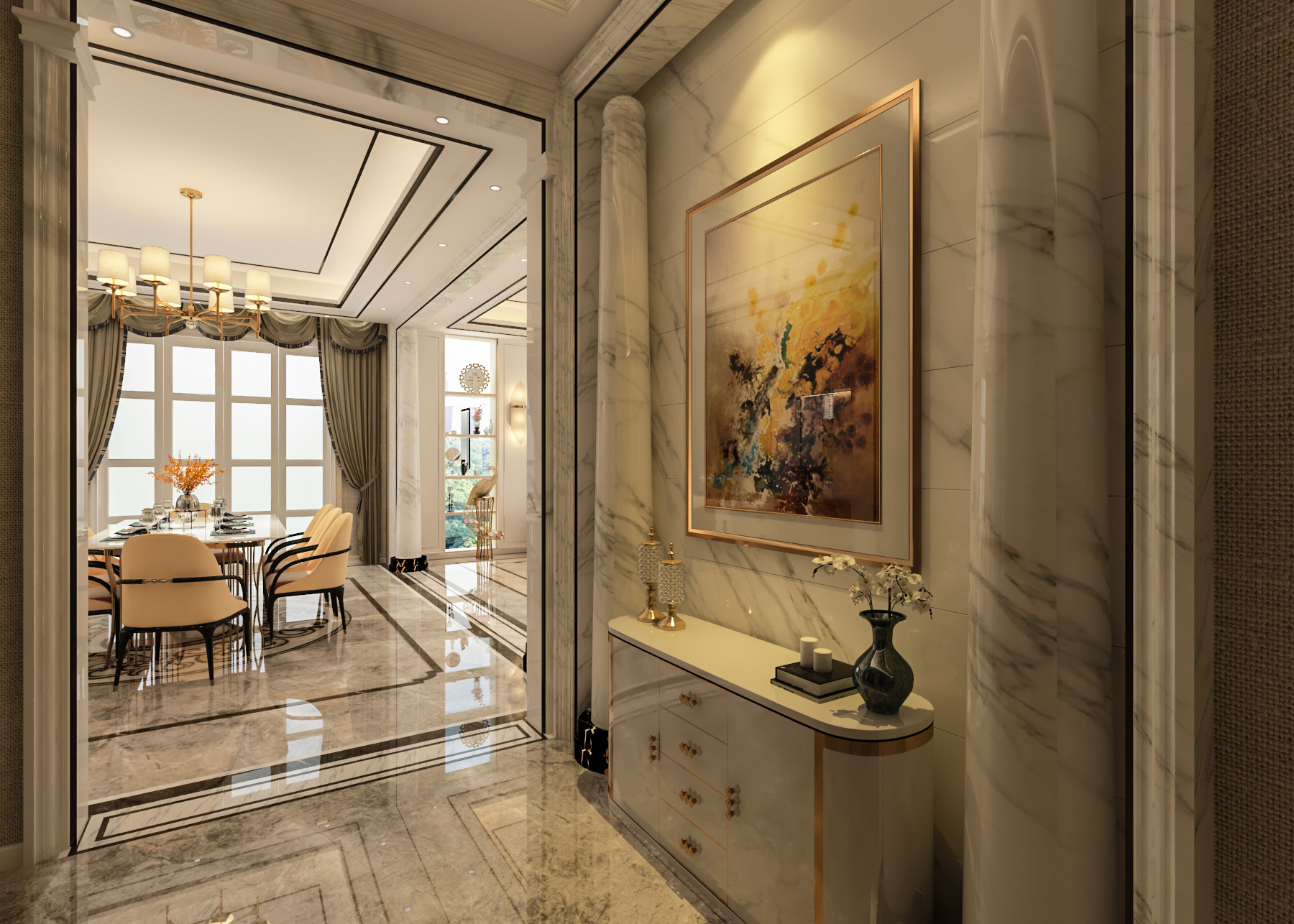 簡歐帶著一點(diǎn)輕奢的感覺,整個(gè)公共空間線條硬朗,材質(zhì)感比較強(qiáng),私密空間一溫馨舒適為主。同風(fēng)格案例:更多>>