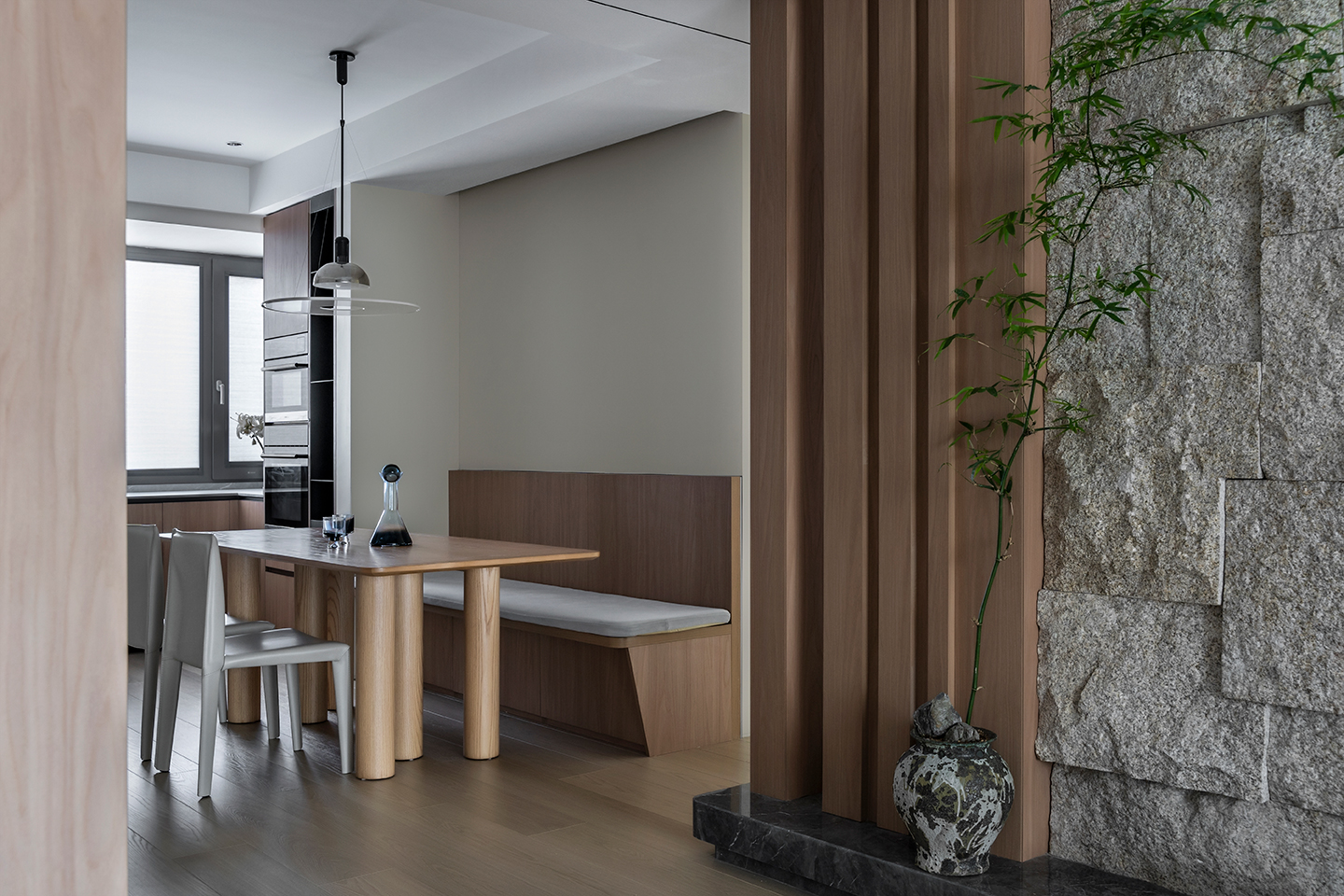 客廳背景處利用了天然毛石的質感,體現自然的主題。