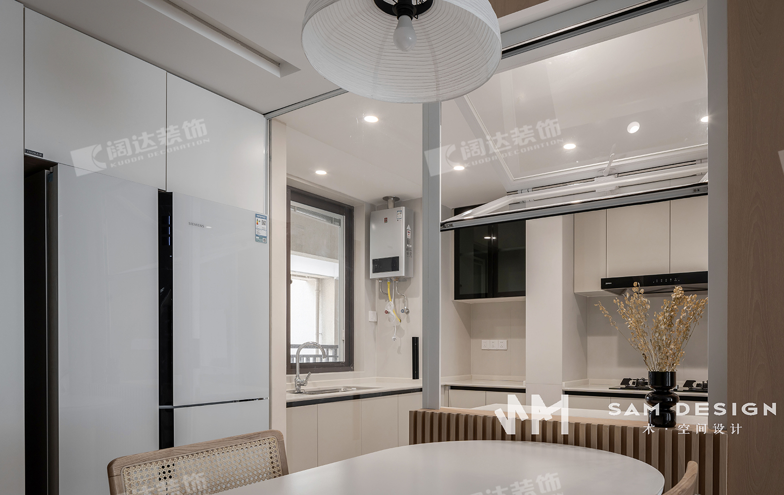將原本的封閉式廚房改為了半開放式廚房,中廚與西廚功能合并,但是在使用上又互不打擾,島臺連接餐桌的處理既增加操作空間也賦予了空間美感。
