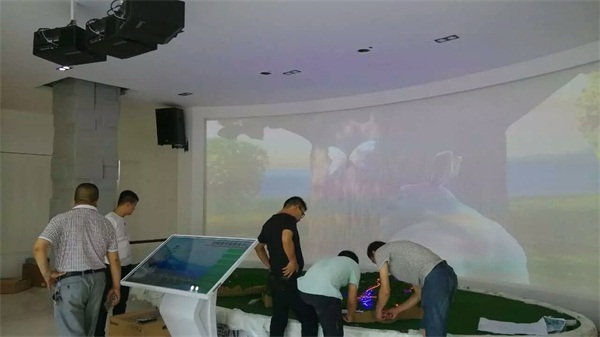 走進頗具現(xiàn)代感的后柳鎮(zhèn)黨群服務(wù)中心,最引人注目是的扶貧展廳設(shè)計中的高科技數(shù)字沙盤。據(jù)了解,該數(shù)字沙盤由東方久瑞負責(zé)打造。項目共采用5臺索諾克 -DSX700工程投影機(采用A02鏡頭):其中3臺SNP-DSX700工程投影機,通過吊裝正投融合輕松實現(xiàn)弧形7.2米*2.5米的超大投影畫面;另外2臺則在吊頂內(nèi)隱藏安裝,通過融合,投射到地面面積為3米*1.5米的沙盤上。5臺索諾克SonnocSNP-DSX700工程投影機的完美配合所呈獻出來的視覺效果堪稱完美。整套系統(tǒng)播放后柳鎮(zhèn)的整體規(guī)劃及未來展望,大屏幕顯示和沙盤相結(jié)合,同時采用觸摸屏控制和播放整套顯示系統(tǒng),操控方便,播放流暢,效果一流。