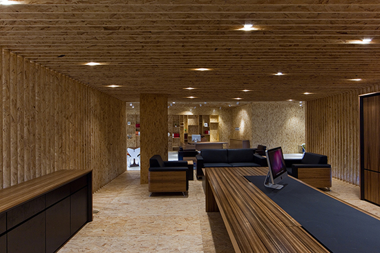 簡約(簡約裝修效果圖)的垂直及橫向線條OSB板結構抽象地演繹了門/窗/屏風(屏風裝修效果圖)/書架/天花等現代(現代裝修效果圖)建筑元素,為整個體驗店建立一個統一、簡約及和諧的多功能展示效果。落地磨砂玻璃把自然光線引入洽談及材料展示區,讓展廳參觀體驗得到舒適及人性化的提升。